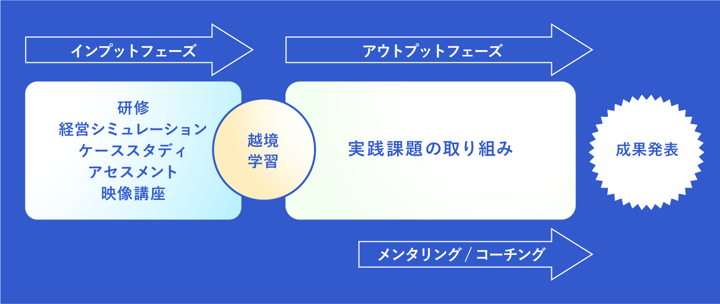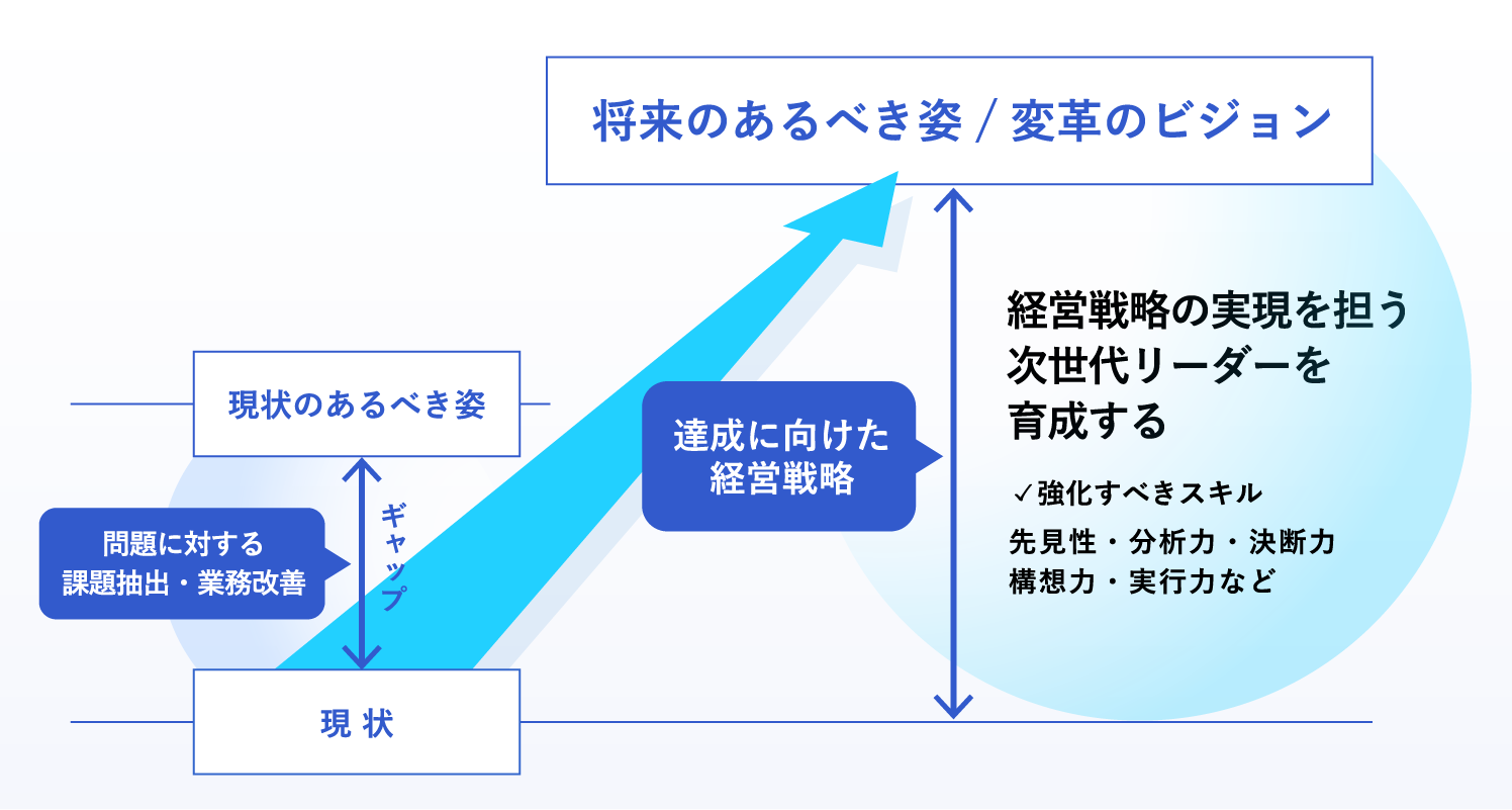 実際の経営課題に取り組むことで、次世代リーダーに必要な経営視点・思考力・判断力を養い、 組織に変革をもたらし、成果を創るリーダーシップと行動変革を促すことをねらいとしています。